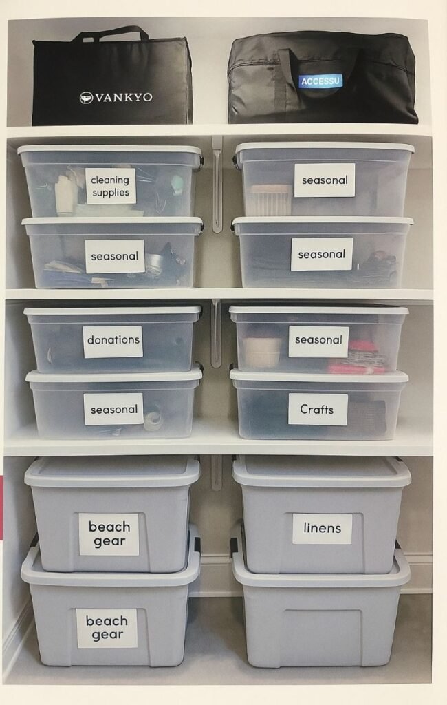 Center view of a neatly organized closet with color-coded clothing, labeled storage bins, and folded jeans—showing how to declutter effectively.